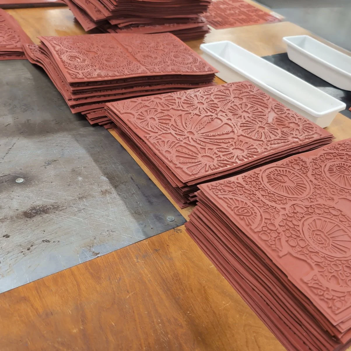 Stacks of vulcanized rubber stamps with intricate floral and geometric patterns on a wooden worktable.